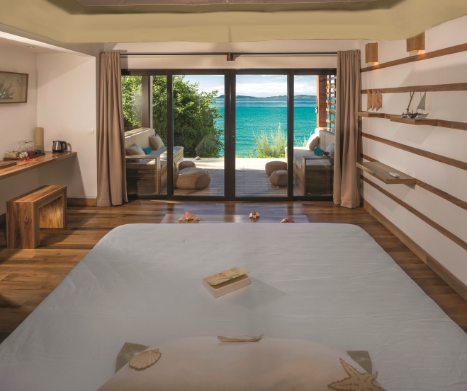 Even the spa stays true to the castaway spirit, with luxury massages provided on a bed situated above the ocean, with gorgeous sunset views. The palm-thatched treatment room and shower hewn into the rock of the island enhance the experience. The spa features natural products infused with the aroma of local plants such as ylang-ylang, vanilla, coconut and sweet orange.