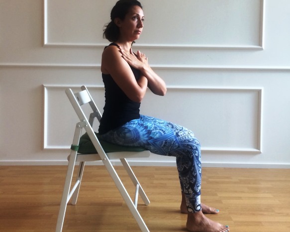 Cross your arms over your chest. Take a gentle twist to one side, and then return to the center. Keep your chin up and your spine neutral. This activates the spine into rotation and eases tension in the back and shoulder girdle.