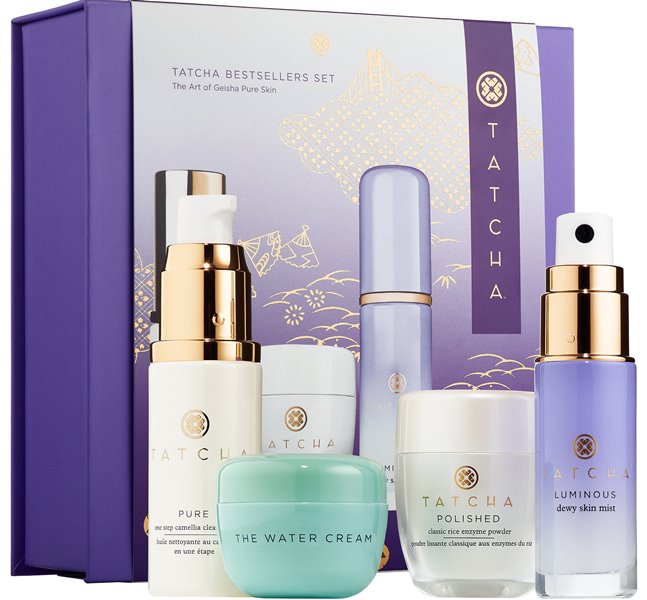 This exclusive collection of Tatcha bestsellers offers a daily ritual to purify, polish, and nourish skin inspired by the beauty secrets of geisha, the original makeup lovers. Natural active ingredients are as effective as they are pure, advanced by science to reveal brighter, smoother, baby-soft skin. One Step Camellia Cleansing Oil is a lightweight, antioxidant-rich makeup remover and cleanser of camellia and rice bran oils that melt away even waterproof makeup, leaving behind silky skin. Classic Rice Enzyme Powder is a creamy, water-activated exfoliant of nourishing rice bran and conditioning pearl that polishes skin to a jewel-like luster. Gentle enough for daily use, it reveals smooth, baby-soft skin. The Water Cream bursts upon application to release skin-improving nutrients, powerful Japanese botanicals, and refreshing hydration for clear, poreless skin that is perfectly prepped for makeup. Dewy Skin Mist provides a boost of soothing hydration, resulting in dewy, luminous skin anytime, anywhere. You can wear under foundation to prep skin, or mist on top to set makeup.
