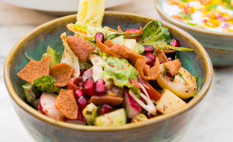This classic mezze from the Middle East is served with a fresh new twist by adding sweet and crunchy green apples to the cucumber, tomato, lettuce and pomegranate mix.