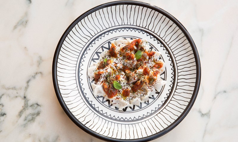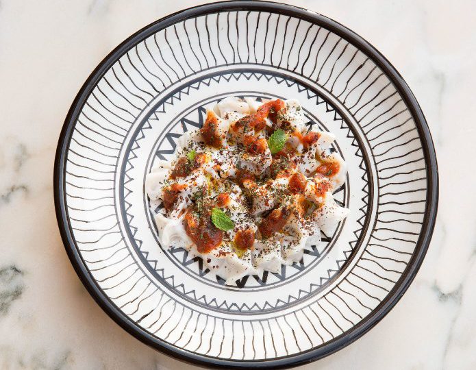 These Turkish dumplings, or ravioli, are divine. Served with a garlic-yogurt sauce and Aleppo pepper, they are one of the chef’s favorites.