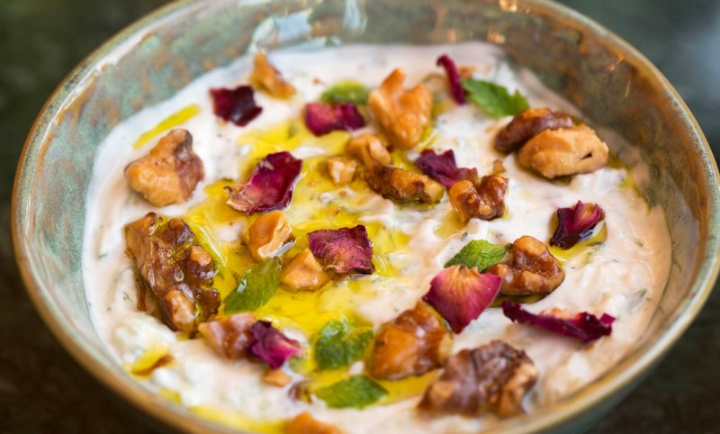 A delicious appetizer, this yogurt-based dip is served with mint and cucumber. Sprinkled with walnuts and green grapes, it’s simply perfect on warm pita bread.
