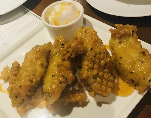 My drink of choice was fresh coconut water, straight from a green coconut, with a paper straw (yes, they are environmentally friendly, which is a big plus), while my dining partner went for plain orange juice. And since I wanted to have a real contemporary Thai cuisine experience at this Fuchsia Urban Thai restaurant, we decided to go all-in, from starter to dessert. Our starters were made up of prawn cakes, mild clear seafood soup, and their customer-favorite seafood salad with glass noodles, with of course their complimenting condiments.![]()