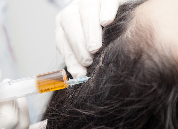 During the treatment, some blood is drawn from the patient’s arm and centrifuged to separate the plasma from the red blood cells. The platelet-rich plasma is then injected into the scalp directly at the level of the hair follicles. Treatments are done once a month for the first three months and thereafter every three to six months. Results can be seen as early as two to three months after the first procedure.