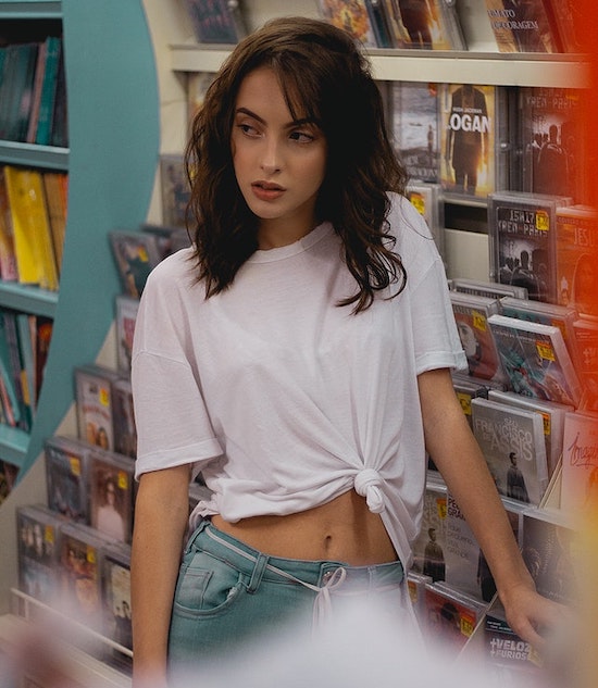 One of the easiest ways to stay trendy and enjoy your forever T-shirt is to play with the hem: you can tie a knot above the waistline or crop it or simply tuck into the bralette and show off your midriff proudly. This look best suits active ladies that like to implement a sport-style into daily outfits.![]()