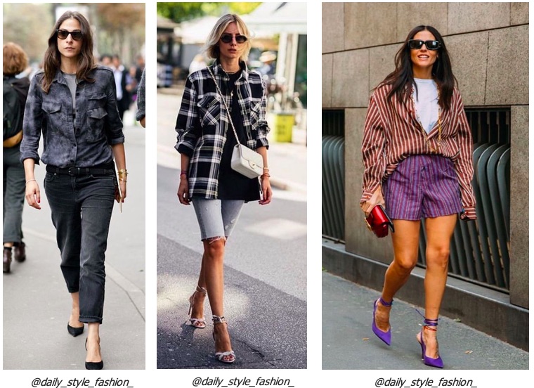 This styling trick is famous amongst men but successfully adopted by ladies. The way of combining these two independent garments is rather traditional when the T-shirt is served as an undershirt and is shown when the owner wishes to cool down and can unfasten the shirt to let air in. But nowadays we use this layering trick to make a unique and appealing look. By experimenting with shirts and blouses of different fabrics and styles you can create totally different looks as a result.![]()