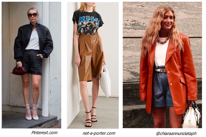 Today’s hit – leather shorts or Bermudas perfectly paired with softness and the clarity of a basic T-shirt. The contrast of materials makes this look work! You could increase the intensity if you put on a leather jacket or blazer, otherwise, a neutral soft trench coat will be a perfect match. And never forget about accessories, they make the final touch of your look 😉![]()