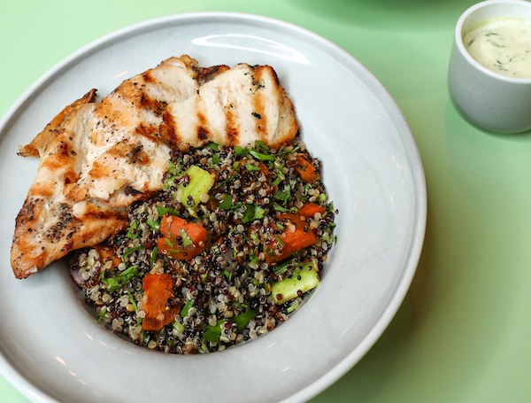 - The Gym Bunny: A filling date, banana, almond milk and oat smoothie; seven spice carrot and quinoa salad with chicken breast and coriander dressing; winter veg crudités; and a red apple.