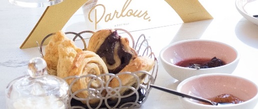 This afternoon tea experience features everything from a variety of Parlour Boutique signature pastries, fresh from the patisserie, to a selection of sandwiches, savory tartines and homemade scones and Danishes, and preserves.