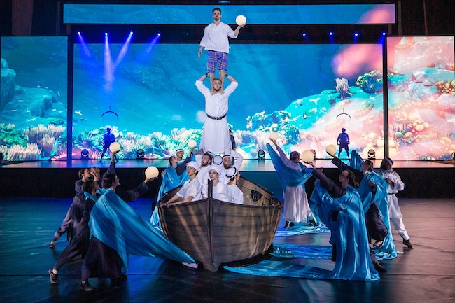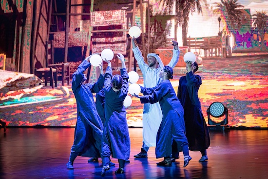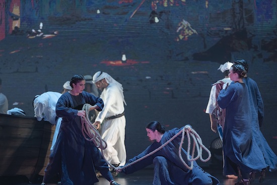 The pearling scene is a theatrical vision of the pearl divers’ trip and is eloquently depicted with awe-inspiring sound effects, music, and engaging choreography. The scene highlights the significance of these pearl diving trips and the range of emotions including feelings of fatigue and celebration associated with the pearling season.