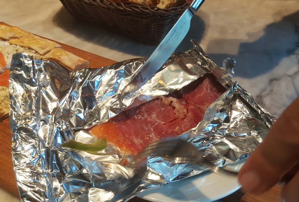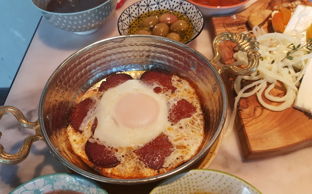 In addition to the handcrafted selection of oven-fresh breads and the unlimited Turkish tea, there was a selection of Turkish cheese, home-made jams, Agean olives, honey, and Kaymak. We were also served their signature oven-baked Pastirma (a kind of Turkish cured beef), which they unwrapped right on our table while it was still sizzling. The other delights of the morning were Sucuk eggs ( a form of Turkish sausage baked in eggs), and then Menemen (Turkish scrambled eggs with tomatoes, chilies and lots of olive oil).