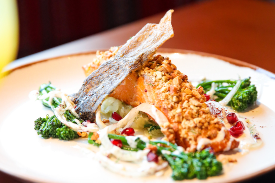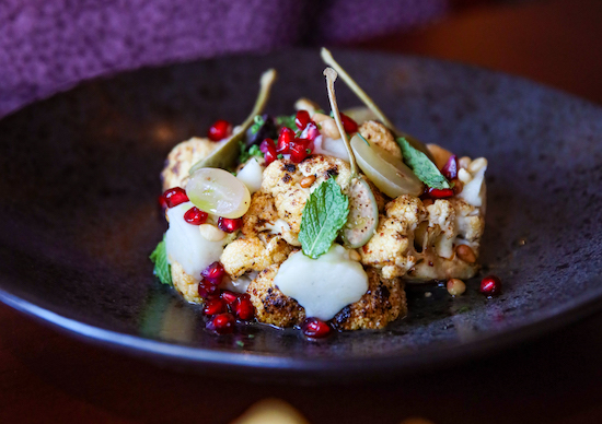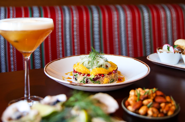Bar nibbles include savory Dubai donuts filled with zaatar and feta cheese mousse, smoked mozzarella ciabatta with garlic and truffle oil, and crudites with kale and sunflower seed hummus.
