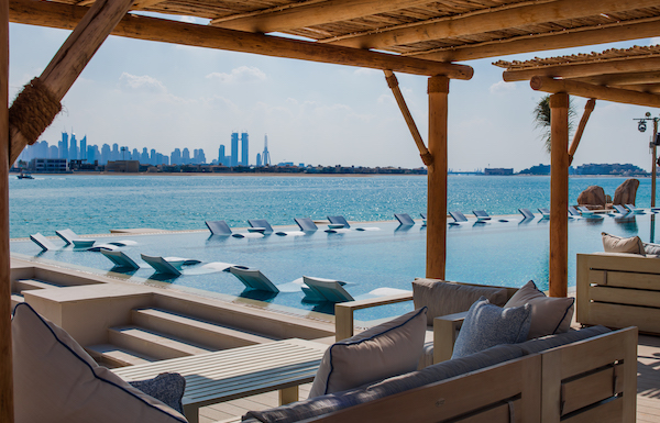 Offering a dreamy slice of paradise with an in-tune-with-nature ambience, it exudes a rustic simplicity featuring a white-washed wooden deck, accommodating cushioned loungers and wooden pergolas. The deck leads out to the immaculate beach as well as the glittering infinity pool– complete with floating beds – which imperceptibly drops off into the ocean beyond. Shaded by palm trees and cream crocheted umbrellas, there is no better place to while away a day in the sun, or a cosy night while watching the glittering Dubai skyline.
