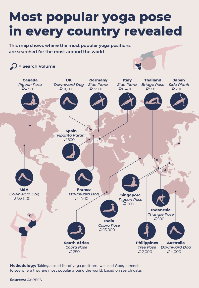 That said, do you know which are the most popular yoga poses? The research team at a private UK rehab clinic, Delamere, took the time to analyze Google Search data in order to determine the most popular yoga poses in each country around the world.